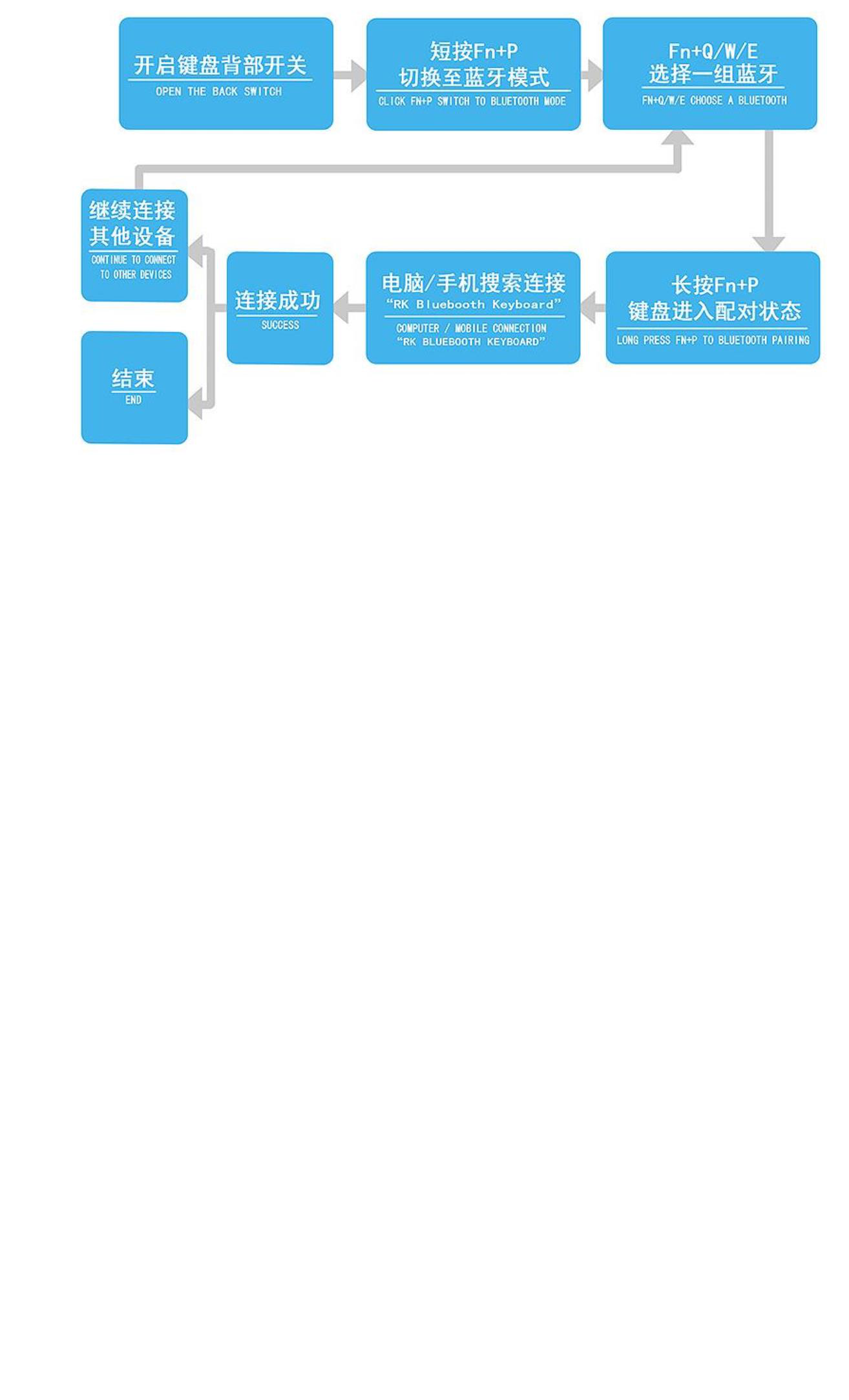 以此类推,重复以上步骤,Fn+Q/W/E 可同时设置并存储三组不同的蓝牙设
