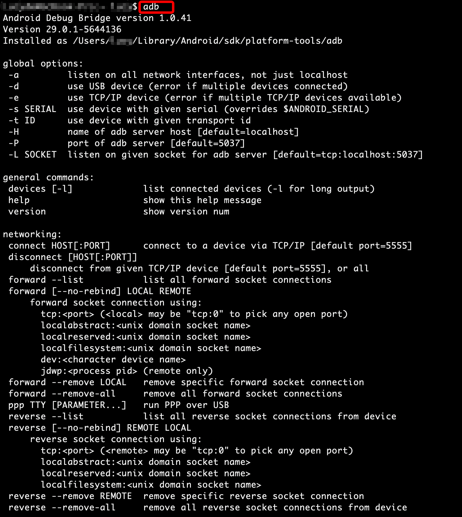 (4)然后在终端输入adb,出现一长串帮助说明,证明adb已经配置好了,如图