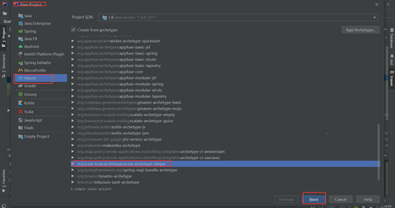 选择Maven,在archetype中选择:org.scala-tools.archetypes:scala-archetype-simple,如下: