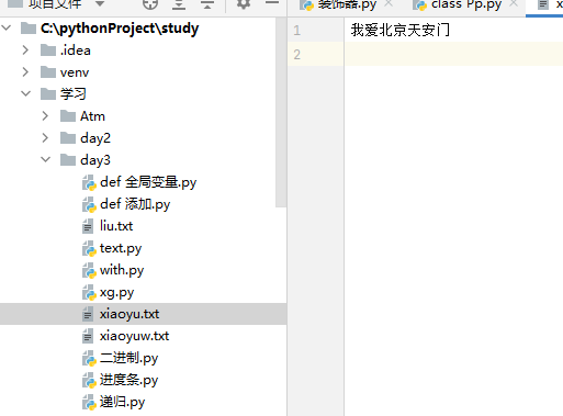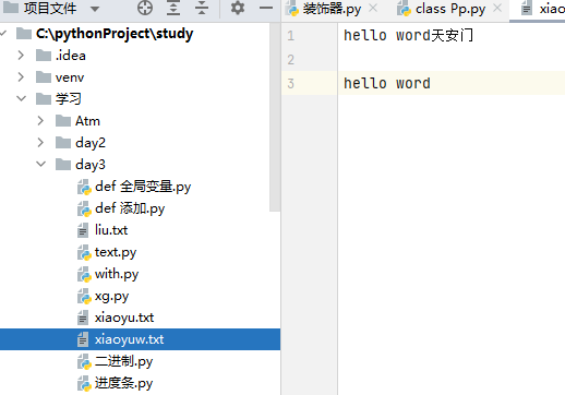 file = 文本的路径或文本的名称,例如上图可以直接填写文本的名称,也可以写文件的路径C:\pythonProject\study\学习\day3\xiaoyu.txt