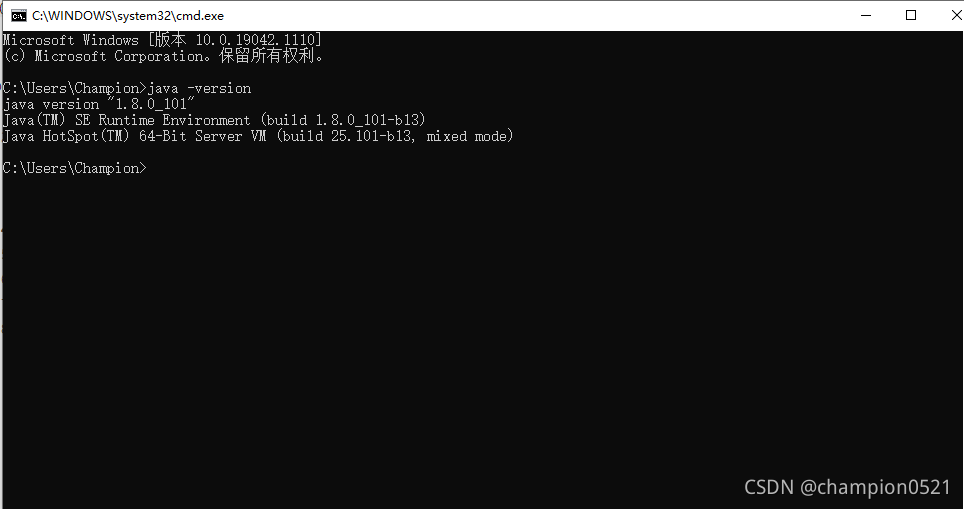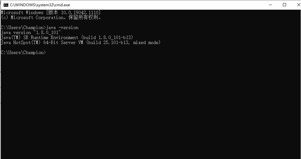 环境变量配置成功后,可使用 win+R 打开命令提示符,输入 java -version 命令,可以正常出现 JDK 版本号,即环境变量配置成功,如下图所示: