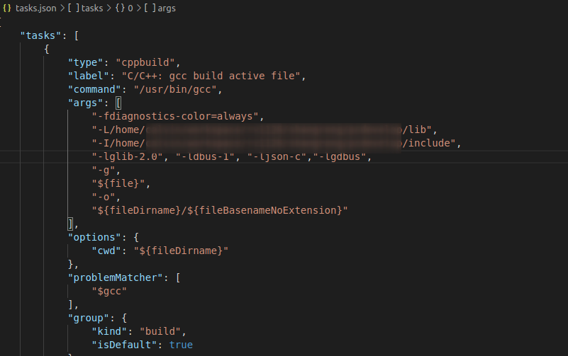 在tasks.json中可以配置gcc编译的相关参数