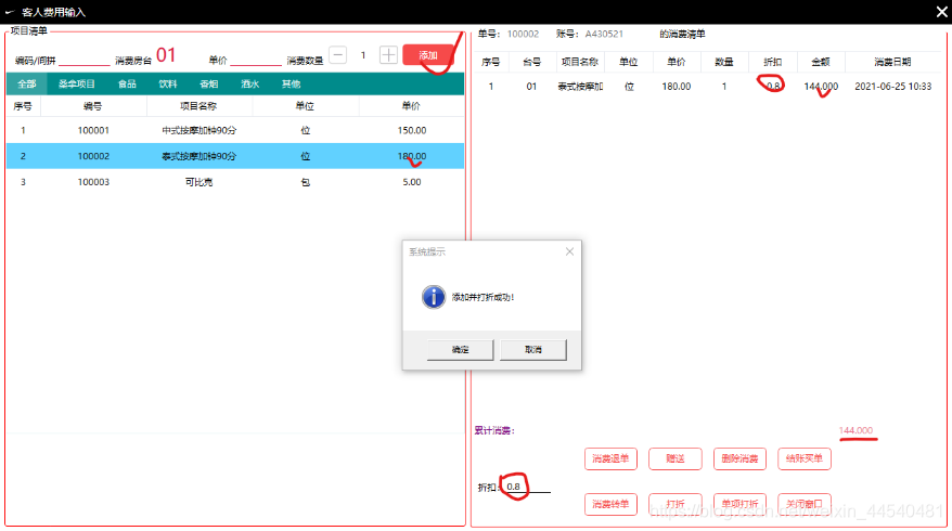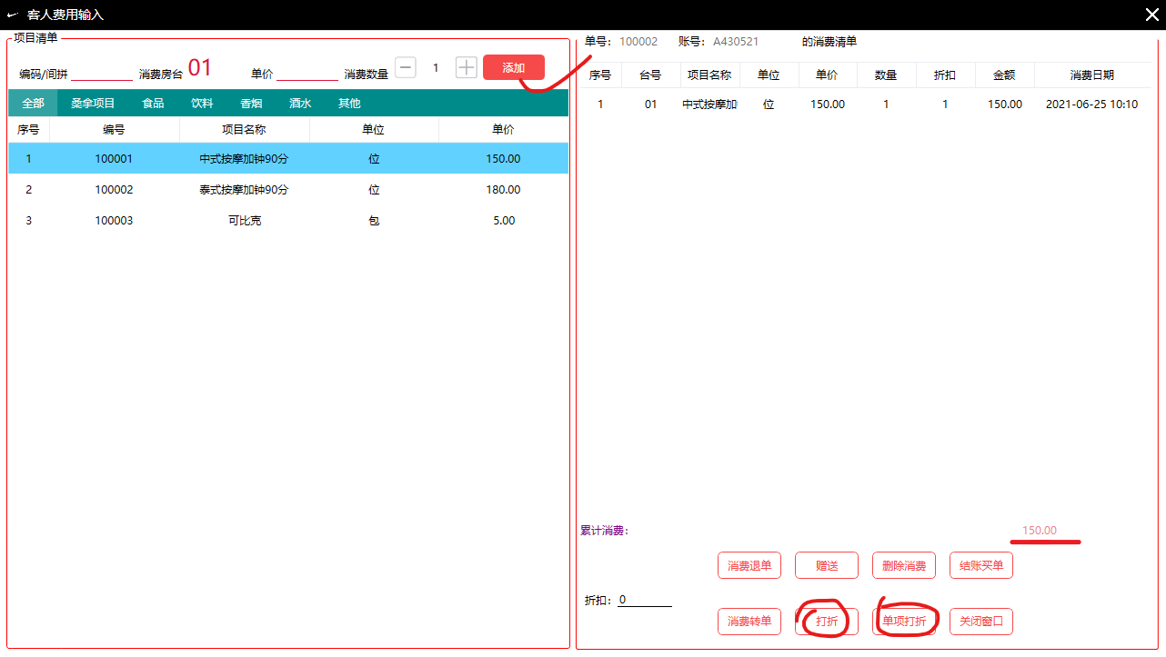 打折(整单):添加左表项目清单信息,得出右下方累计消费金额,然后根据输入的折扣信息进行打折,并修改累计金额。