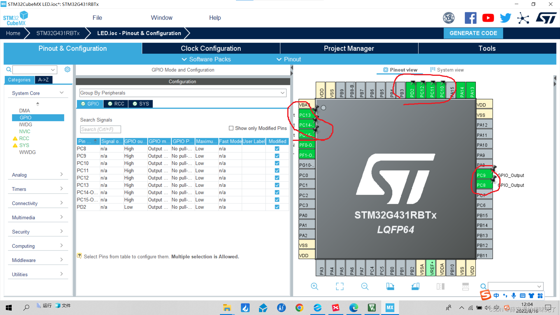 3、配置GPIO——推挽输出模式,一共有八个,PC8~PC15