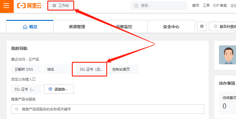 想要获取https协议所需的安全证书,我们需要回到域名平台,并找到SSL证书页面(我们是在阿里云购买的域名,因此回到阿里云)