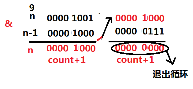 2.采用位运算来解决(右移给定的数):给定一个数1(0000 0001)作为比较基准,给定的数n的最右边的位与1进行逻辑与的操作,结果为真,计数器自加;操作一次,n右移动一位,直到n变为0结束。