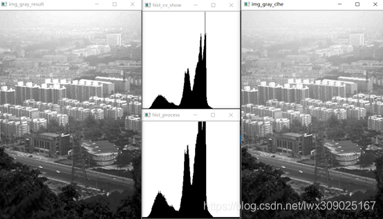 左侧为原始灰度图,中间上方为其灰度分布;右侧为HE处理后得到的图像,中间下方为其灰度分布;对比灰度分布可知右方图像的灰度分布更为均匀,图像效果上来看结果图像对比度更强。