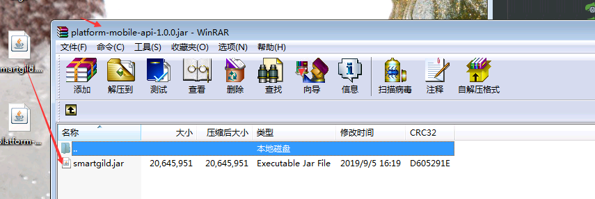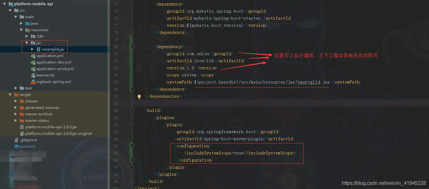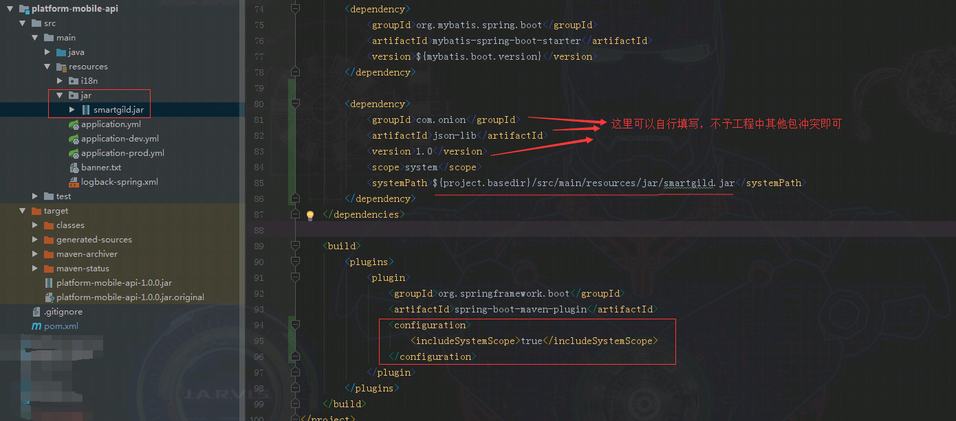 我要将smartgild.jar 这个包引入到 platform-mobile-api.jar 这个项目里打包后jar包的路径在BOOT-INF\lib目录下