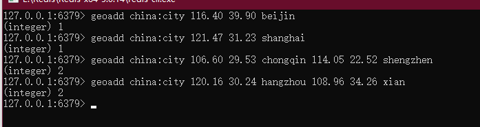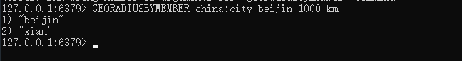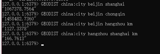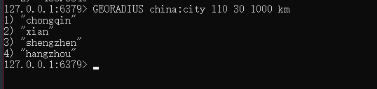 GEORADIUS china:city 110 30 1000 km 以110 30 这个经纬度为中心,寻找方圆1000km的城市