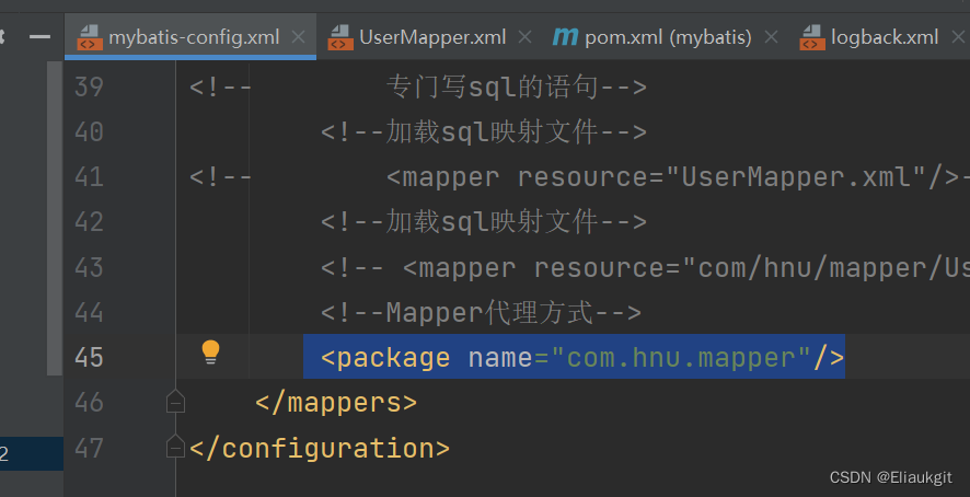 如果Mapper接口名称和SQL映射文件名称相同,并在同一目录下,则可以使用包扫描的方式简化SQL映射文件的加载。也就是将核心配置文件的加载映射配置文件的配置修改为