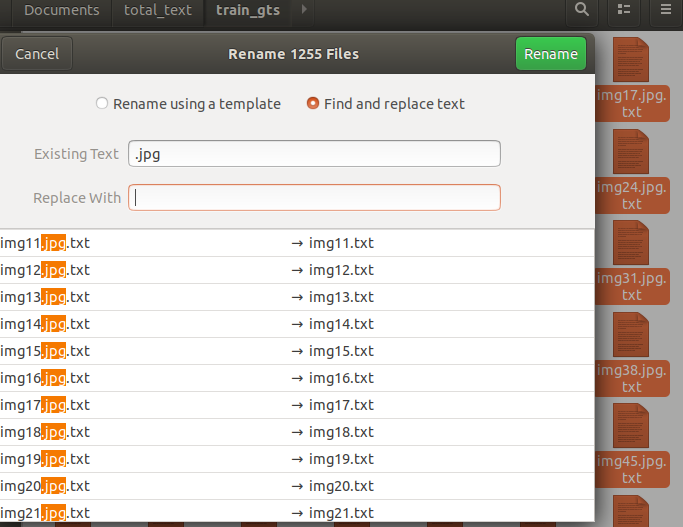 我要处理的数据如下,想把所有文件名改为img11.txt格式,要把‘'.jpg' 去掉。本来想直接写个python 脚本,后来发现很简单的方法。
