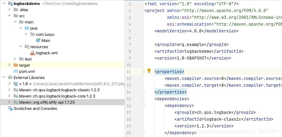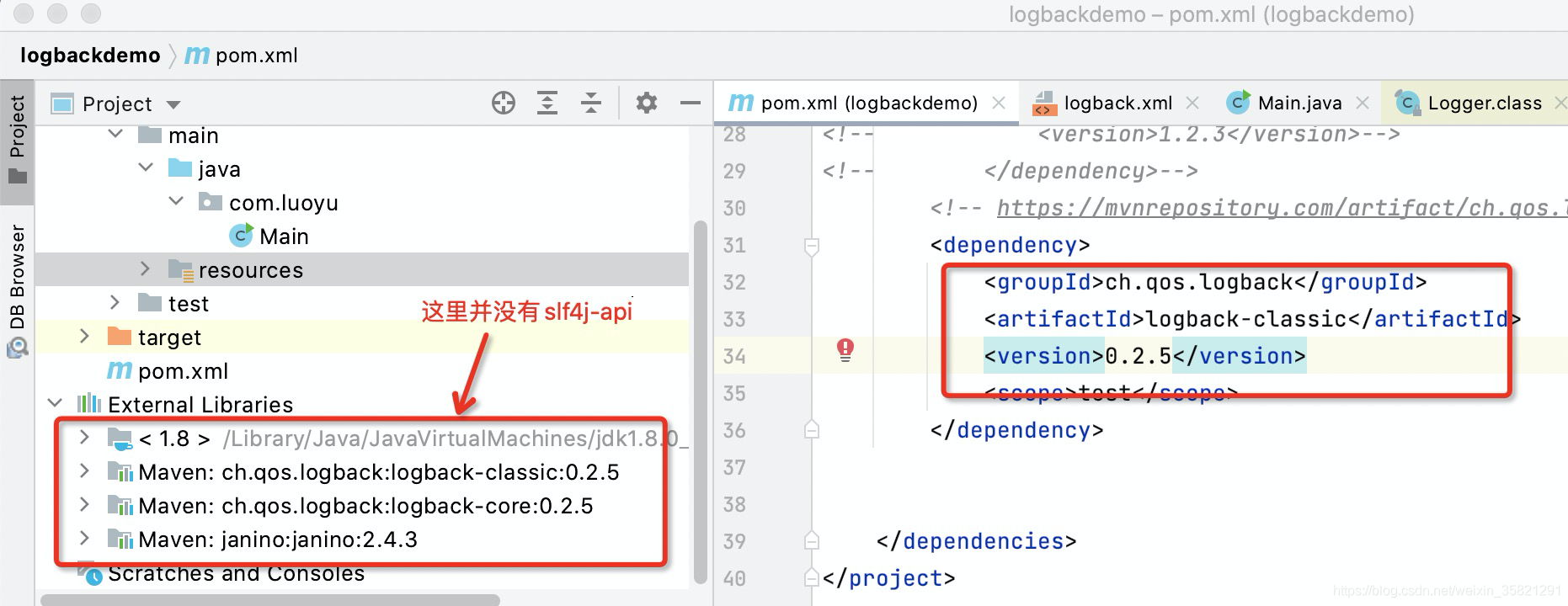 可以看到引入logback-classic的时候,也会自动依赖slf4j-api(所以说,这里也实现了slf4j,可以直接使用呢)