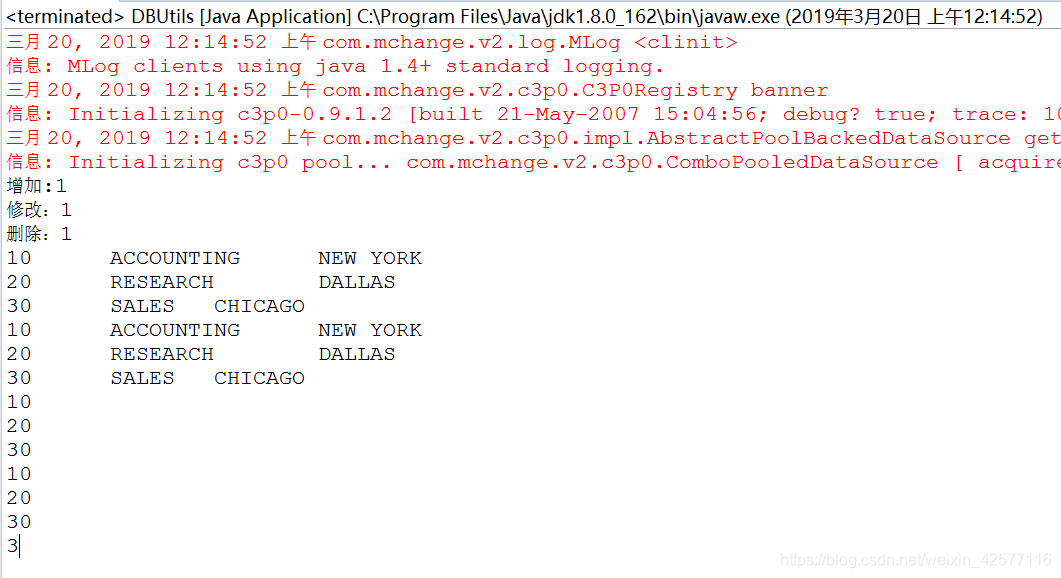 下面这个类,通过QueryRunner来进行数据库的增删改查,并且将结果封装到不同的结果集中,其中连接池来自于C3P0连接池,通过前面的C3P0连接池工具类获取,DeptBean为一个JavaBean