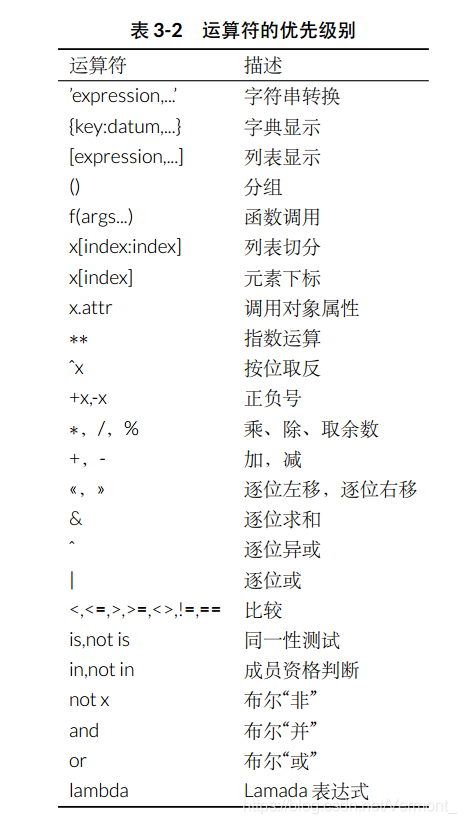 >>> 3 * 4 + 1在上⾯的表达式中,应该先进⾏加运算还是乘运算?为了搞清楚这个问题,我们需要明⽩Python 中运算符的优先级别,表3-2显⽰了运算符的优先级别,依次从⾼到底排列如下: