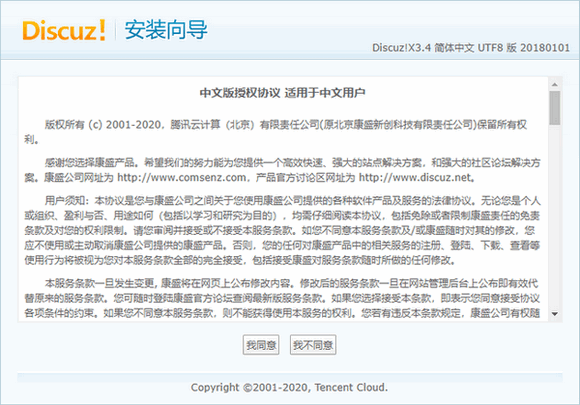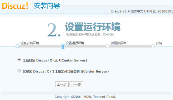 - 在 Web 浏览器地址栏中,输入 Discuz! 站点的 IP 地址(即云服务器实例的公网 IP 地址)或通过 相关操作 获取的可用域名,即可看到 Discuz! 安装界面。如下图所示: