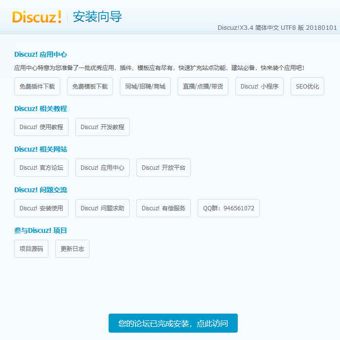- 安装完成后,单击您的论坛已完成安装,点此访问,即可访问论坛。如下图所示: