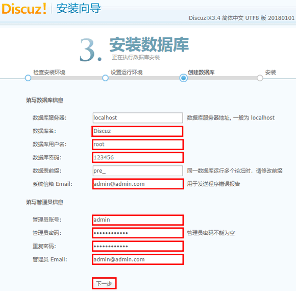 - 根据页面提示,填写信息,为 Discuz! 创建一个数据库。