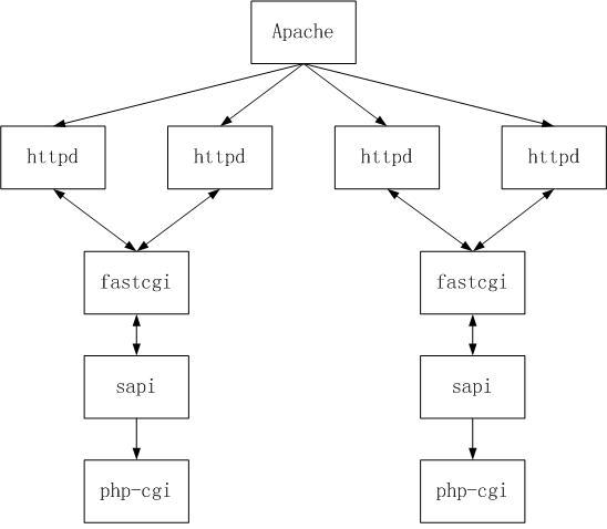 mod_fastcgi模式则刚刚相反,fastcgi是一个独立与apache和php的独立个体,它随着apache一起启动,生成多个cig模块,等着apache的请求: