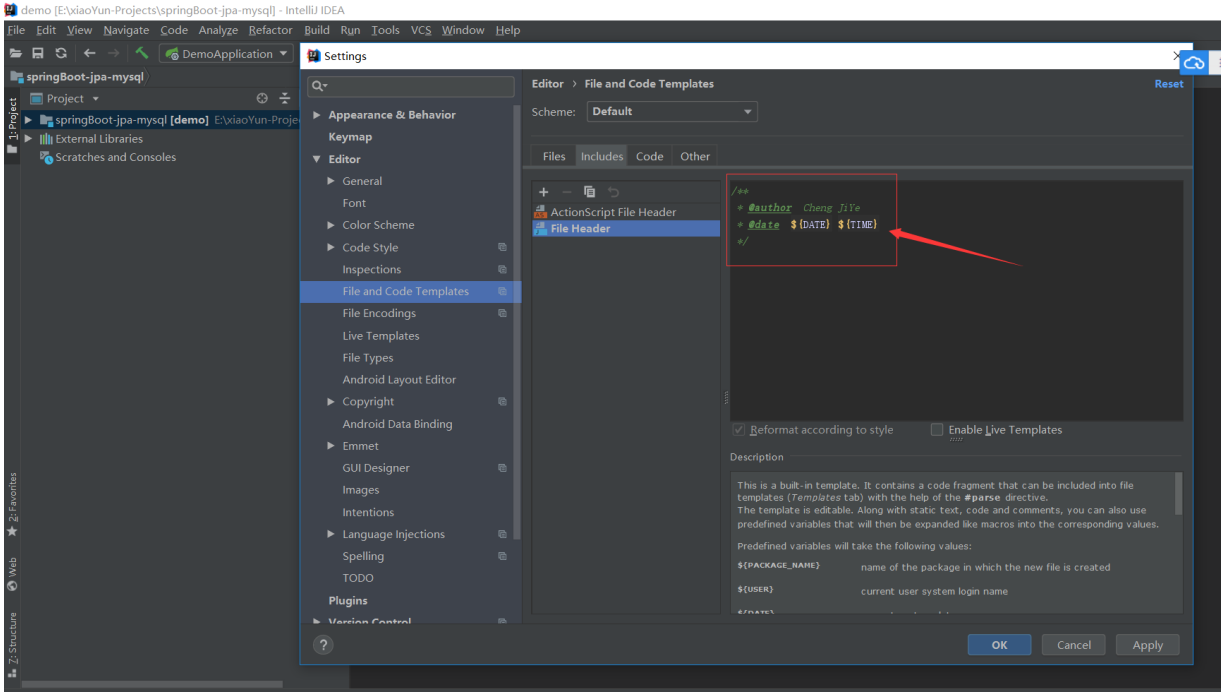 idea设置类作者信息 /** * @author yd * @date ${DATE} ${TIME} * @version 1.0 */版权声明:本文为qq_39999478原创文章,遵循CC 4.0 BY-SA版权协议,转载请附上原文出处链接和本声明。原文链接:https://blog.csdn.net/qq_39999478/article/details/102798786