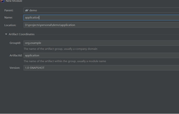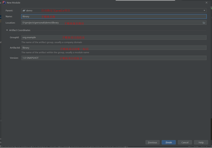 下一步:配置子模块工程的名称、保存路径、组名、唯一标识、版本。然后finish.
