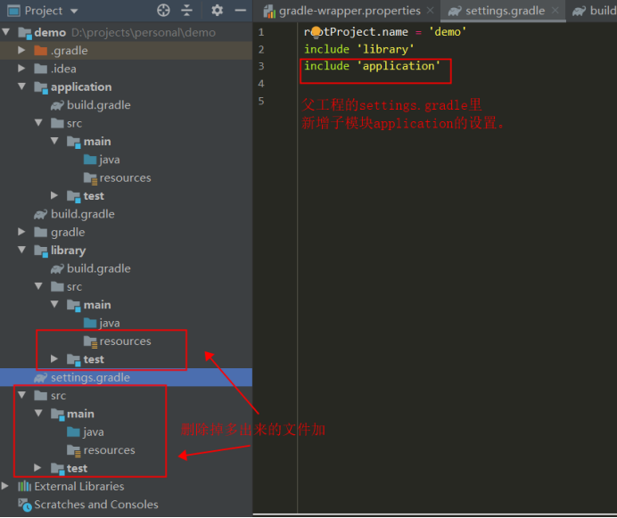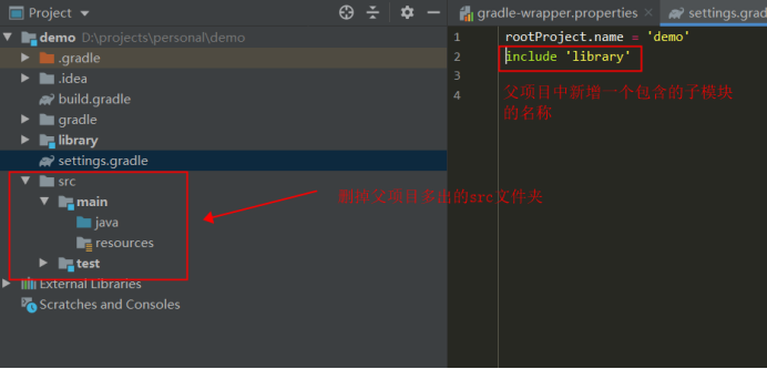 下一步:创建子模块后,idea会对父工程重新构建,父工程会多出个src文件夹,删掉不用。但父工程的settings.gradle新增了一个子模块的配置, 子模块因为不需要单元测试,所以删除test包目录,main包里的resources也不需要,删掉。