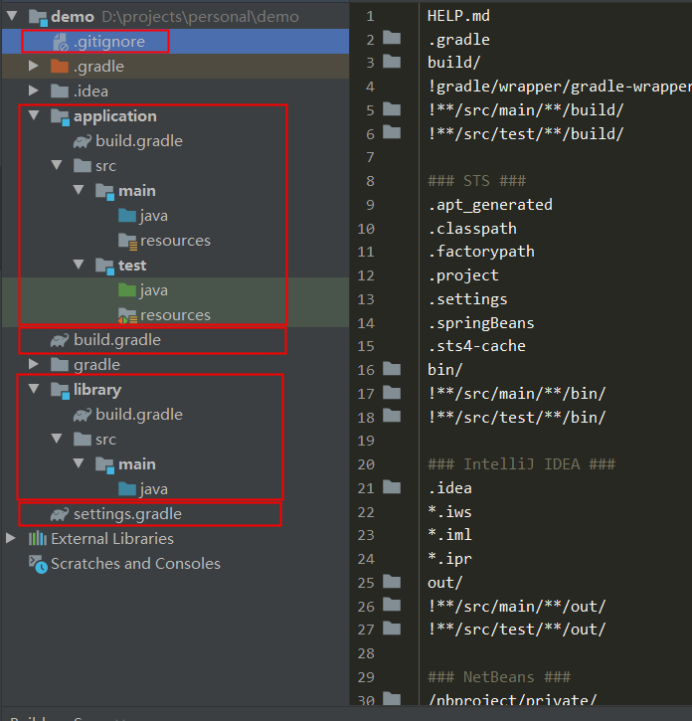 新加一个.gitingore文件(小技巧:.gitingore可以通过选择spring initialzr工程并指定gradle工程生成获得)。最后的工程结构如图: