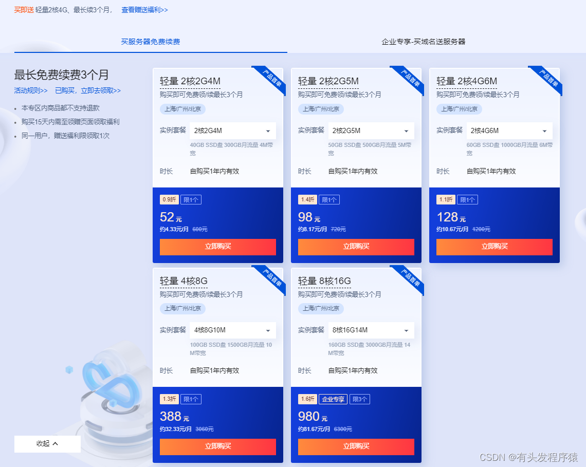 目前腾讯云热销的 轻量应用服务器2核4G,4核8G,以及云服务器CVM2核4G,4核8G的都非常不错,价格也很优惠,搭建个人网站,企业展示型的网站都还是够用的,可参考:腾讯云官方->>>tenxun.dechenyn.com