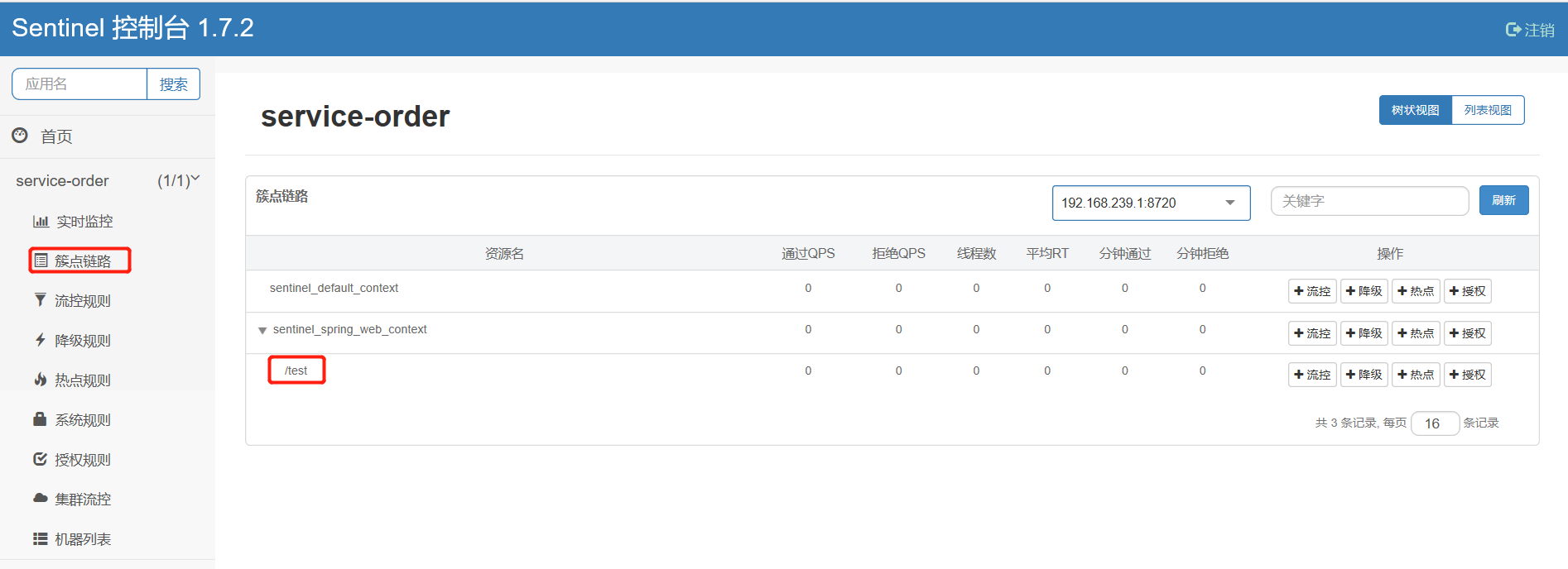 访问该接口:localhost:9009/test,然后刷新sentinel控制台:http://localhost:8080/