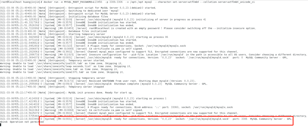 /usr/sbin/mysqld: ready for connections. Version: '8.0.23' socket: '/var/run/mysqld/mysqld.sock' port: 3306 MySQL Community Server - GPL.