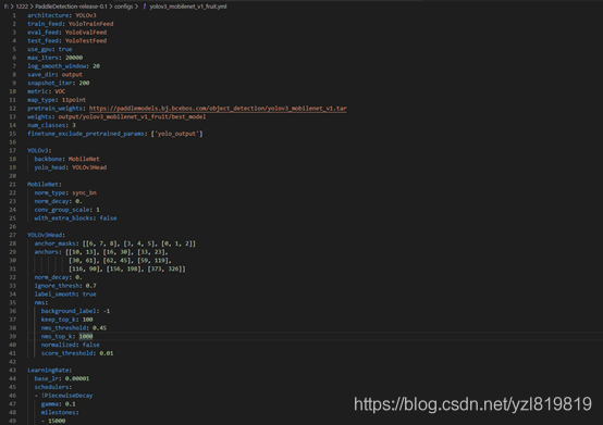 如图下图就是我们选取的深度学习的配置文件,我们选取yolov3_mobilenet_v1_fruit.yml做为本项目的训练配置文件。该配置文件是使用yoloV3的框架,同时主干网络为mobilenet