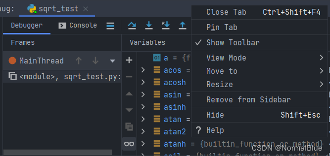 Pycharm的debug图标消失不见了像下图这样debug的进入什么的都不见了,是因为隐藏了toolbar,在debug这行上面右键,把show toolbar点出来就好了,一开始碰到了还不知怎么回事 版权声明:本文为qq_40622310原创文章,遵循CC 4.0 BY-SA版权协议,转载请附上原文出处链接和本声明。原文链接:https://blog.csdn.net/qq_40622310/article/details/126009575