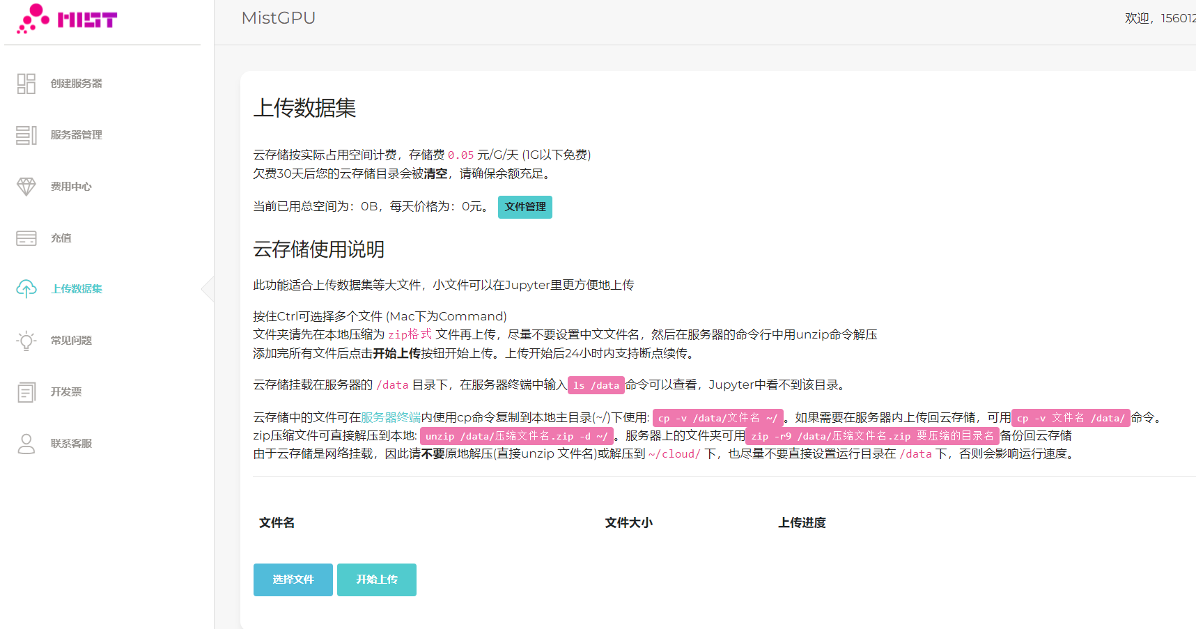 将对应的数据集打包,并在上传数据集栏点击选择文件、开始上传,上传后,数据集会出现在/data目录下