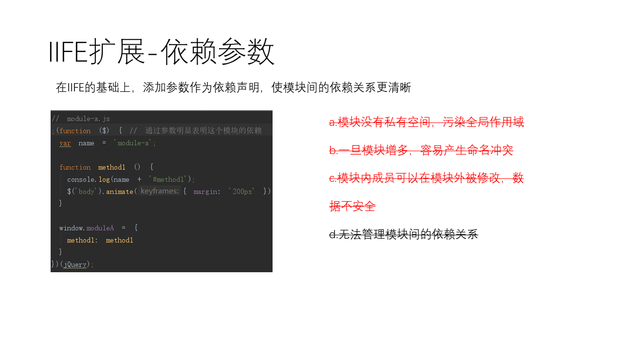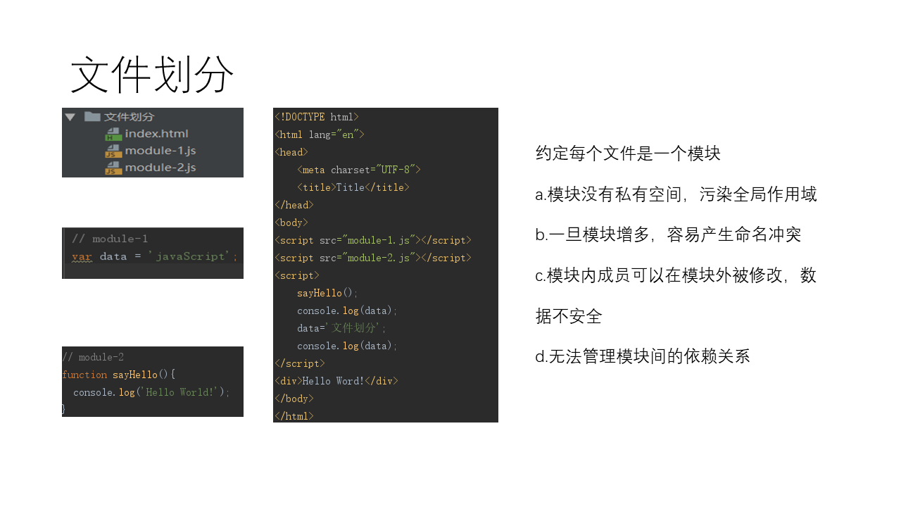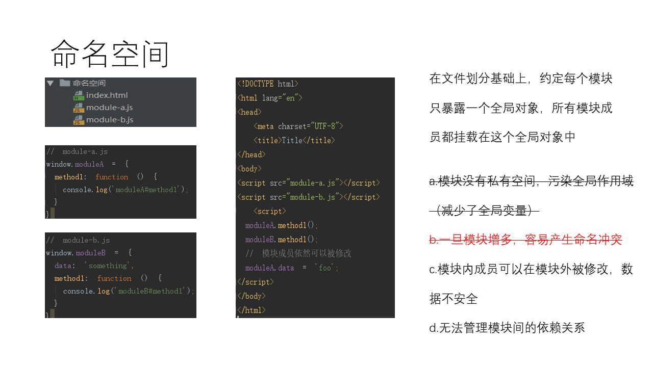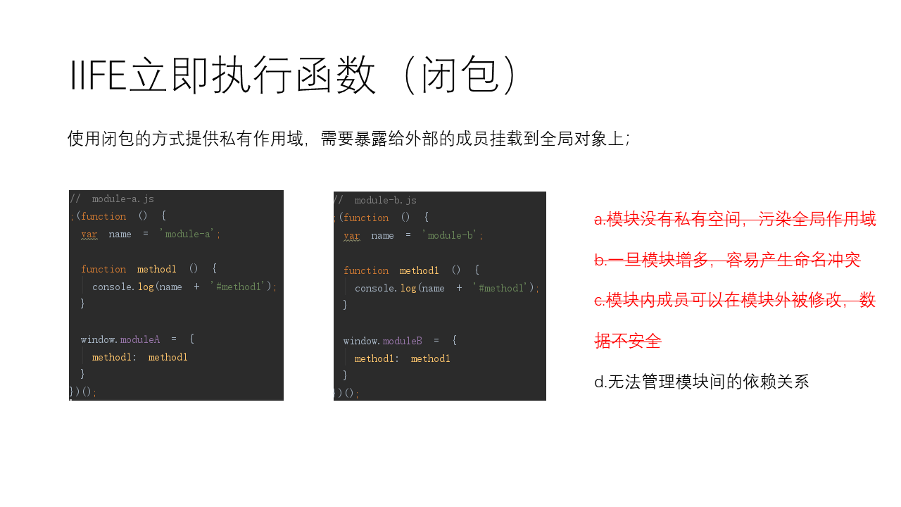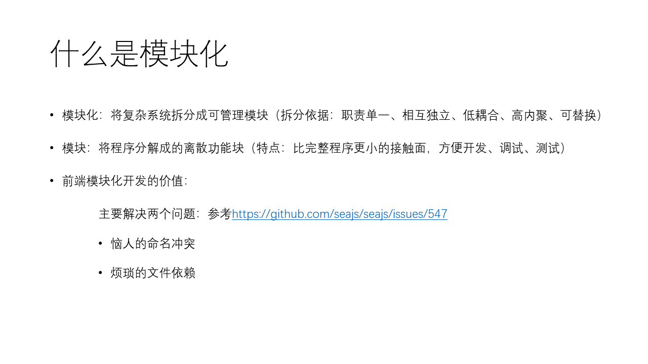 前端模块化发展过程简述 注:以上内容来自于最近的一次组内分享,简单介绍了前端模块化发展过程,部分内容和示例参考网络上优秀的博客和技术文章。版权声明:本文为smk108原创文章,遵循CC 4.0 BY-SA版权协议,转载请附上原文出处链接和本声明。原文链接:https://blog.csdn.net/smk108/article/details/106603939