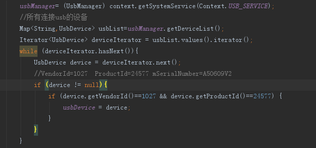 二:查找连接手机的USB设备,使用到的是官方的UsbManager类。分为获取usbManager对象,查找设备就是用到这个对象的getDeviceList()方法,然后通过USB设备的PID和VID进一步筛选我们连接的设备(vid和pid可以通过打印device的信息获取),下面上图。
