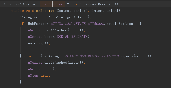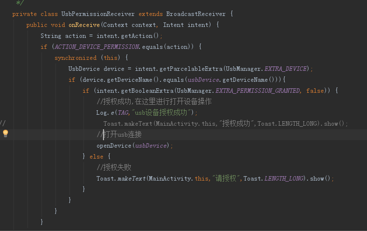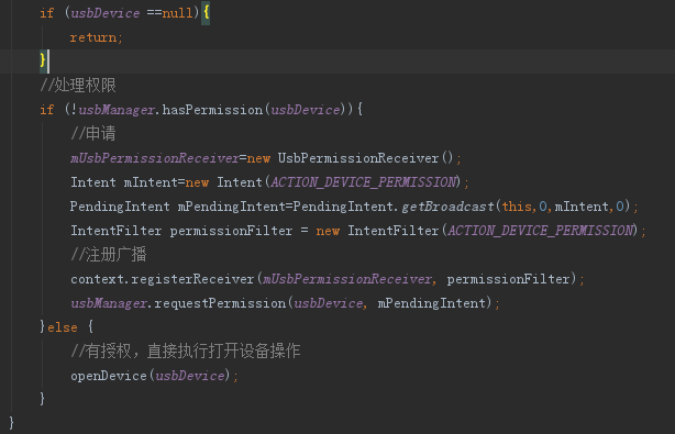 三:USB设备需要用户授权,才能正常使用,处理权限问题。同样使用到了usbManager对象。这里使用到了广播监听用户的授权情况,下面上图。