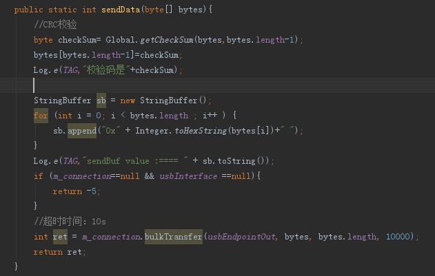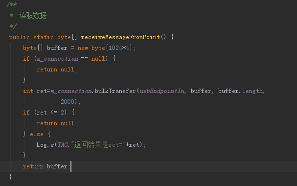 五:读写操作,均使用usbManager.bulkTransfer()方法往USB通道里读写数据,有几个参数,下面以写数据为例,读数据和这差不多。参数1:输入输出端口。参数2:发送的字节数组。参数3:字节数组的长度。参数4:超时时间。返回值ret就是发送成功以后返回实际发送的字节数,可以当做发送成功与否的标志。接收的时候定义的字节数组应该比设备一次返回的字节数组大,查阅的资料是最少应该比设备返回的字节数大2个字节,比如设备返回的字节是480,那定义的数组长度应该是>480。接收数据开线程,循环接收,有数据随时处理。