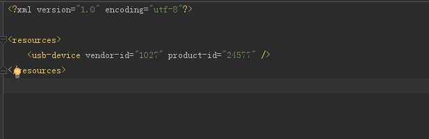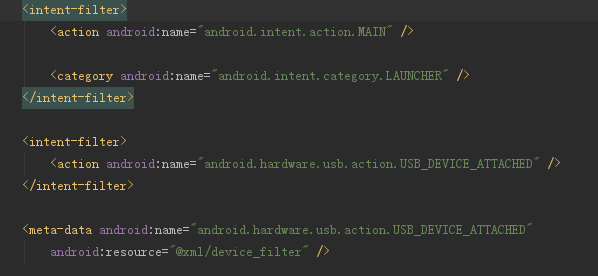 至此,基本完成了主要的通信过程,可也可成功的读取设备数据,但是还需要优化一下,例如随时监听厂家USB设备的插入,自动打开项目。需要在清单文件中作配置。其中device_filter中内容是设备的VID和PID。然后在java中注册监听。