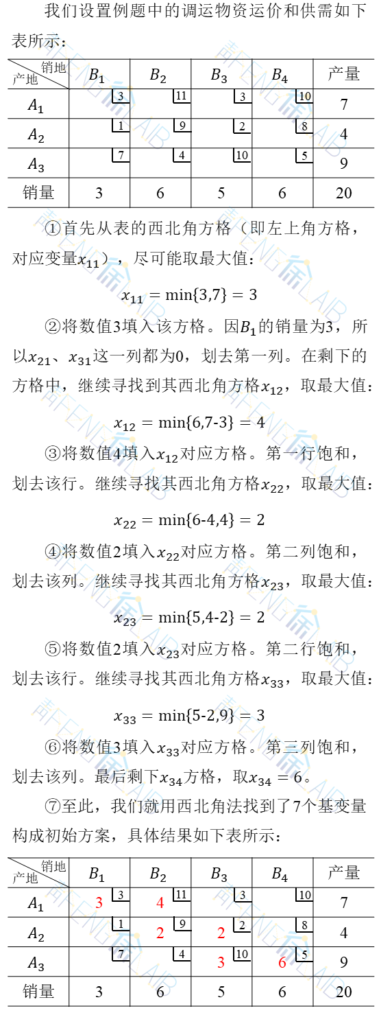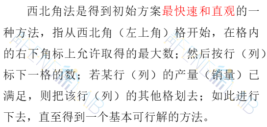 西北角法寻找初始基可行解的优点就是简单快速可行。但是存在解的效果很差的问题,而最小元素法就是利用单价小所以多运的思想克服了西北角法的缺点。