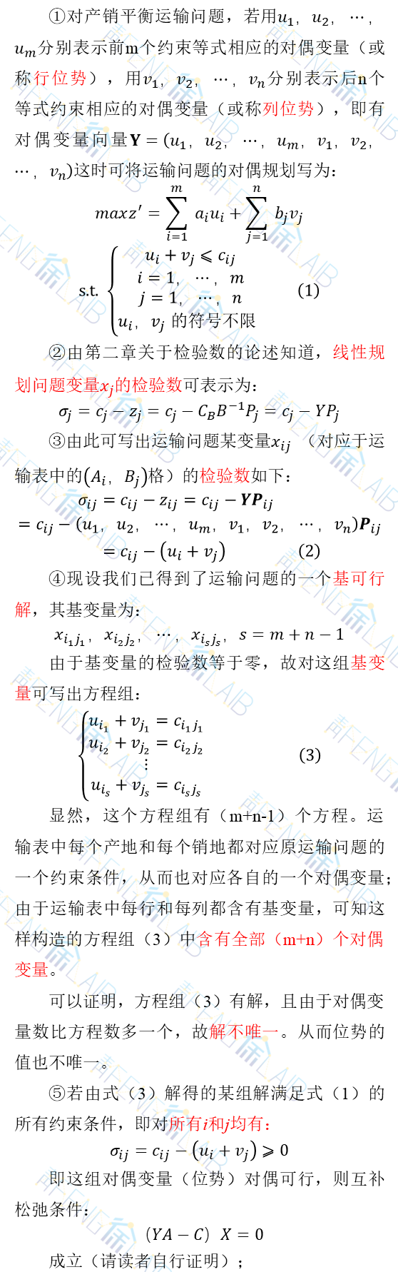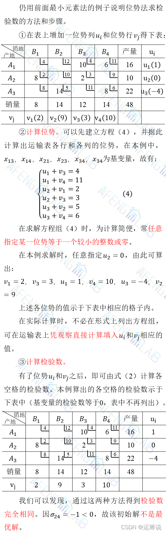 用闭回路法判定一个运输方案是否为最优方案,需要找出所有空格的闭回路,并计算出其检验数。当运输问题的产地和销地很多时,空格的数目很大,计算检验数的工作十分繁重,而用对偶变量法(位势法)就要简便得多。