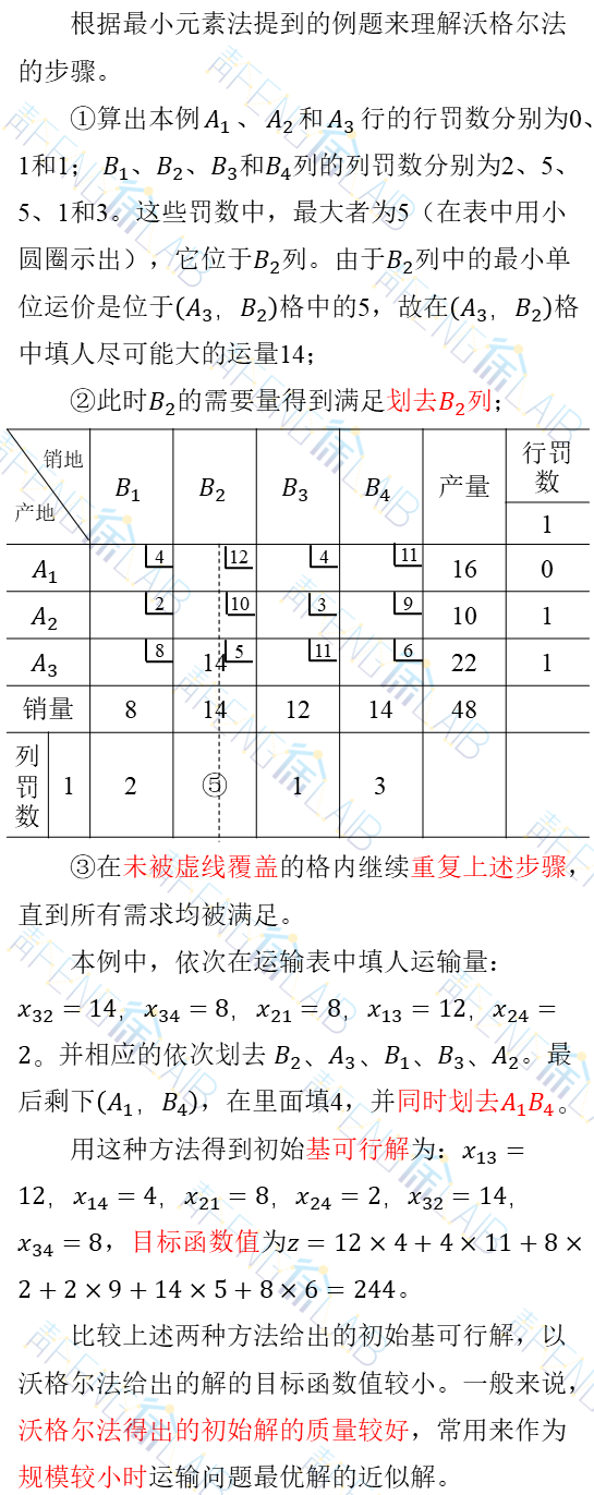 初看起来,最小元素法十分合理。但是,有时按某一最小单位运价优先安排物品调运时,却可能导致不得不采用运费很高的其他供销点对,从而使整个运输费用增加。因此,沃格尔法中对每一个供应地或销售地寻找罚数的做法更加合理,有时制定的初始方案成本要小于最小元素法。