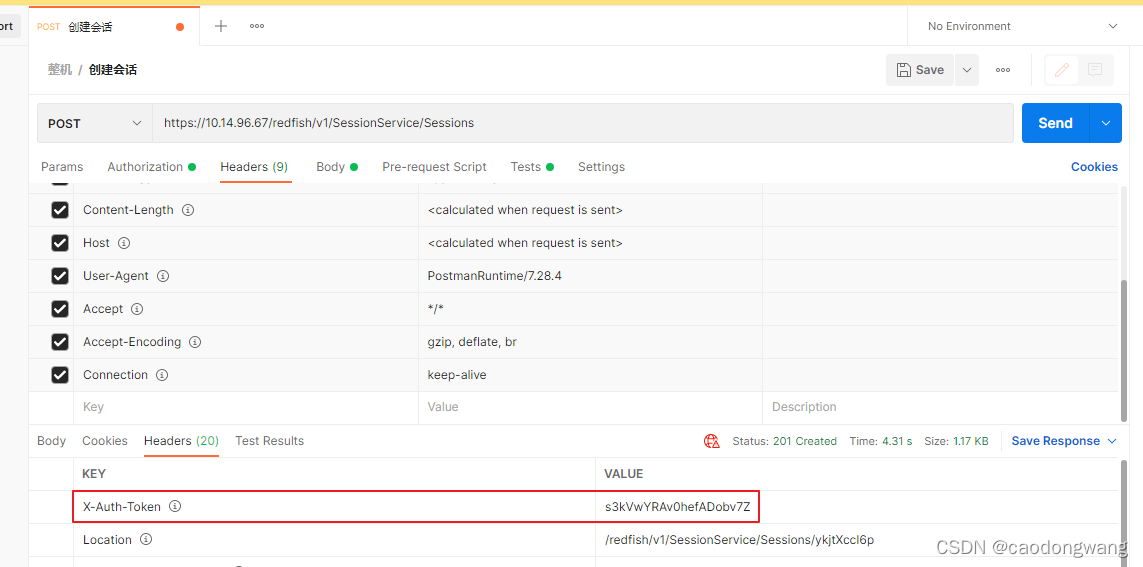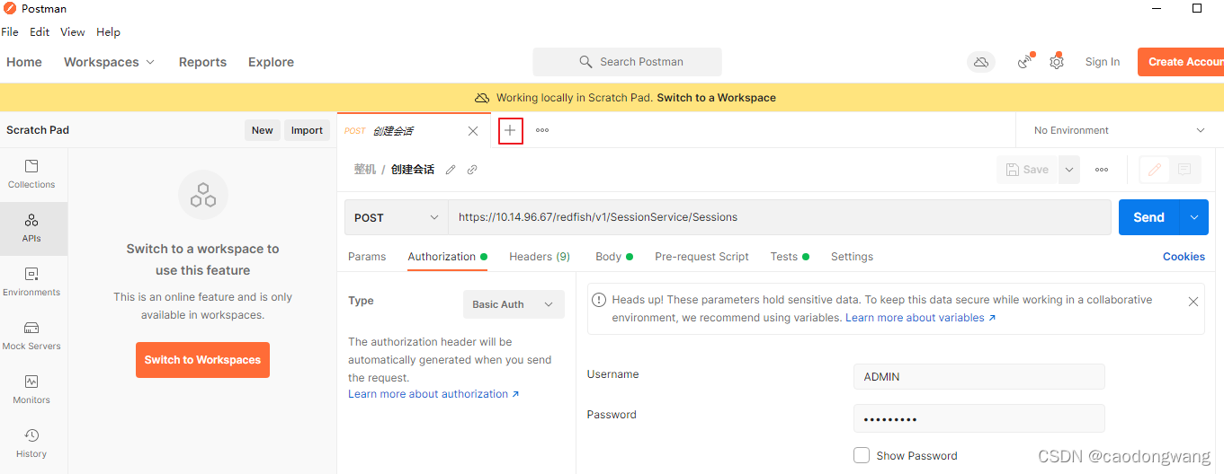 调用方法选POST,url填写为https://device_ip/redfish/v1/SessionService/Sessions,其中device_ip是BMC IP。在Authorization中选择Basic Auth认证,并在右侧填写BMC登录账户及密码。