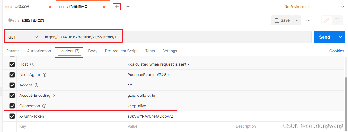 调用方法选GET,url填写为https://device_ip/redfish/v1/Systems/1,其中device_ip是BMC IP。点击发送头标签Headers,新增X-Auth-Token字段,值填写上面记录的值,然后点击右上方Send即可获取信息。注意,Authorization和Body标签下不用填写任何东西。