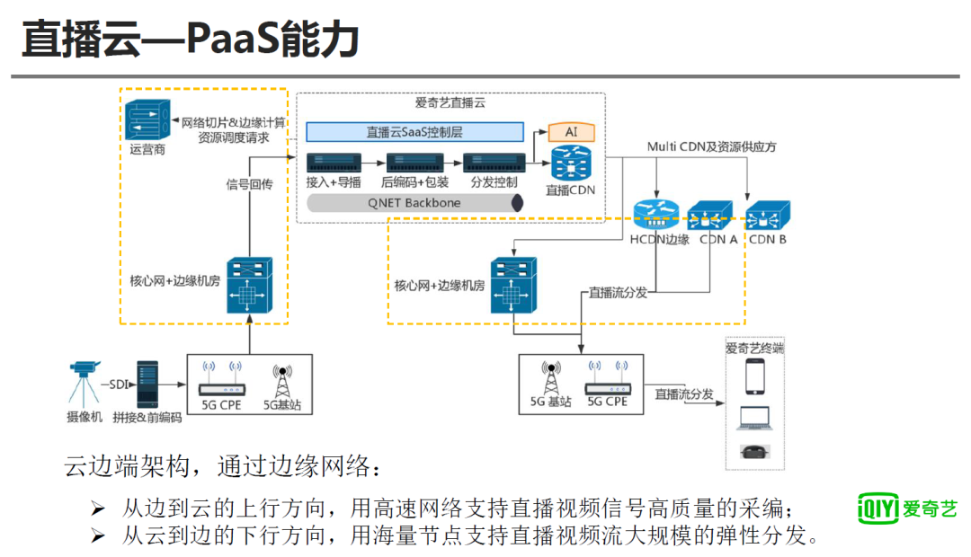 直播云服务就是基于边缘能力进一步实施的超大规模PaaS层分发业务,也会结合5G网络能力继续演进,在边云上行方向通过运营商提供5G边缘和网络切片支持直播信号高质量的采编上行;在云边下行方向,也利用我们的海量边缘设备,支持直播流的超大规模弹性分发。