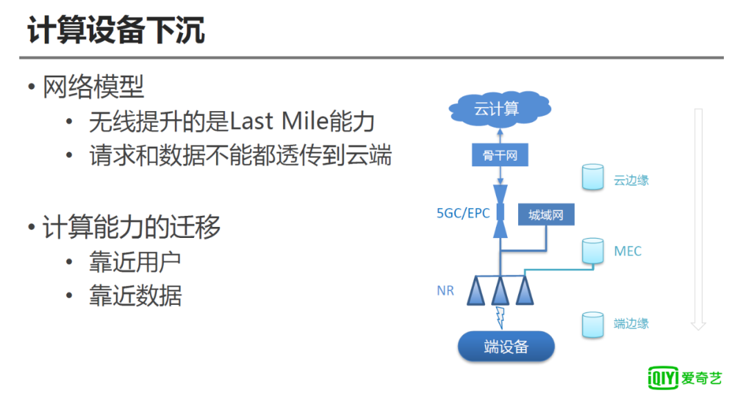 5G NR提升的仅仅是Last Mile无线传输能力,并不是能让端的所有请求数据都要上行传输到云端,也不可能在云端把所有的数据都直接穿过5G核心网实时传输到端上来,网络提供不了这样大的骨干网带宽容量,骨干网的固定延时也比较大。所以,计算资源如何从云上往下沉,部署在城域网边缘或者移动基站边缘,并进一步下沉到端侧,并被高效的使用,是一个很有价值的议题;我们也观察到了这样的迁移现象。计算能力迁移,让算力更靠近用户、更靠近数据,这也是通过边缘计算支撑5G能力的关键点。