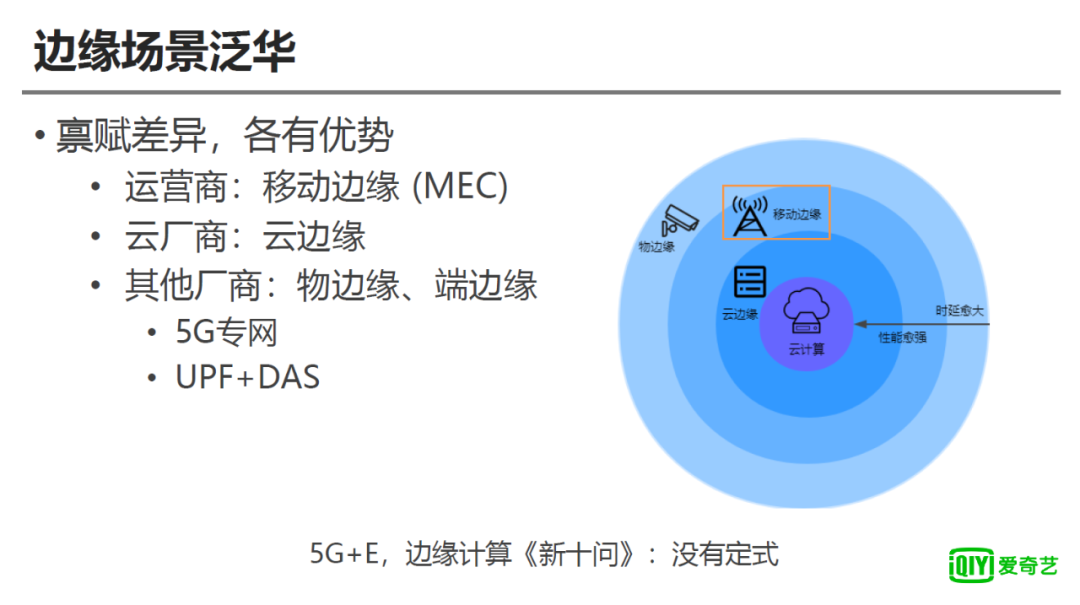 实际上边缘场景已经足够泛化,除了运营商提倡的移动边缘(MEC)外,云厂商也倡导了的由CDN延伸的云边缘,而其他具备端侧优势的厂商则积极倡导了的泛物边缘,大家都在发挥禀赋优势,齐头并进谋发展。最近邬贺铨时隔两年又发起的边缘计算“新十问”中,最后的一个问题就是“边缘计算有没有定式?”