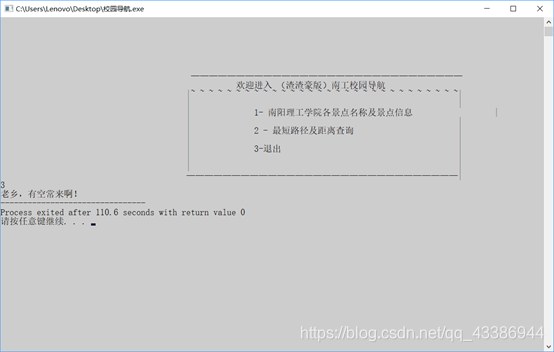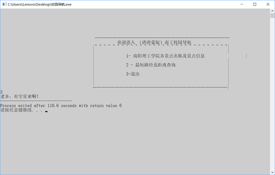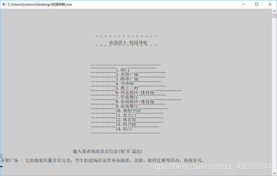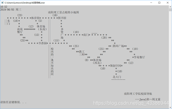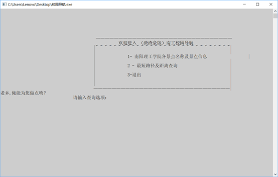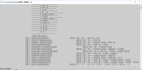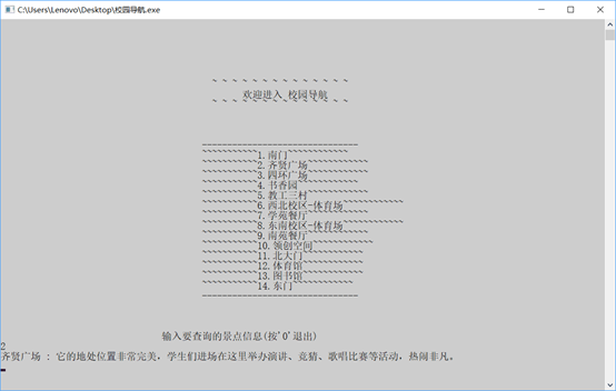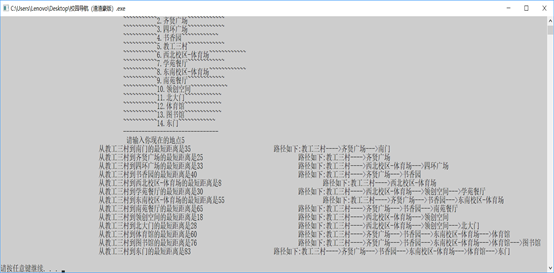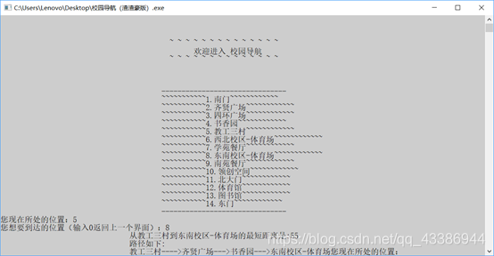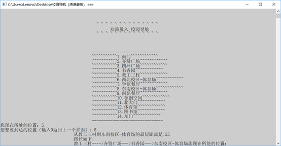设计一个校园导航系统,能咨询学校主要地点,以及从一个地方到另一个地方最短路径,针对最短路径问题,在本系统中采用图的相关知识,以解决在实际情况中最短路径问题,本系统包括定向导航和不定向导航求最短路径两个问题,针对以上两个问题,本系统采用了迪杰斯特拉算法,并为本系统设置了一系列的人性化提示,方便使用者使用。