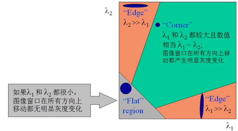 - 图像中的角点。两个特征值都大,且近似相等,自相关函数在所有方向都增大。