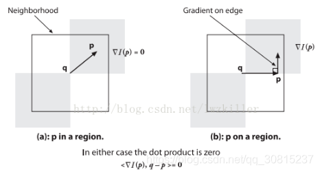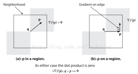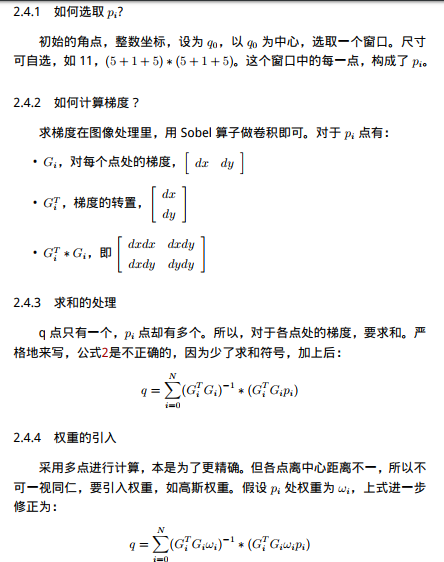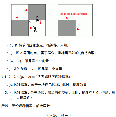 如上图所示,假设一个起始角点q在实际亚像素角点附近。p点在q点附近的邻域中,若p点在均匀区域内部,则p点的梯度为0;若p点在边缘上,则p点的梯度方向垂直边缘方向。如果向量q-p方向与边缘方向一致,那么q-p向量与p点的梯度向量点积运算结果为0。在初始角点(初始角点可能不在边缘上)附近我们可以收集很多组点的梯度以及相关向量q-p,此时的q就是我们所要求的更精确角点位置,那么每一组的向量点积设置为0,正是基于这个思想,将点积为0的等式组合起来形成一个系统方程,该系统方程的解就是更精确的亚像素角点位置。 将新的q点作为区域的中心,可以继续使用这个方法进行迭代,获得很高的精度。
