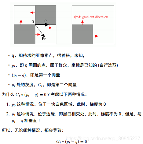 2.2 如何构造方程 最小二乘法需要得到 Xβ = y,才有方程可解。在亚像素角点的求解中, 列方程用到了“垂直向量,乘积为 0”这一性质。 那是哪两个向量相乘呢?看图: