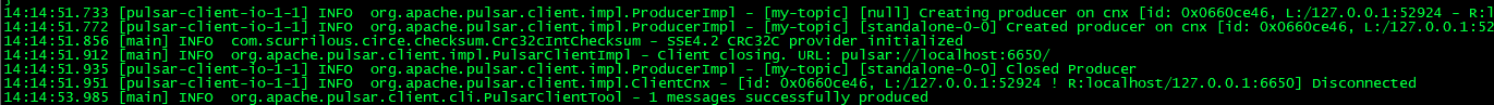 bin/pulsar-client produce my-topic --messages "hello-pulsar"